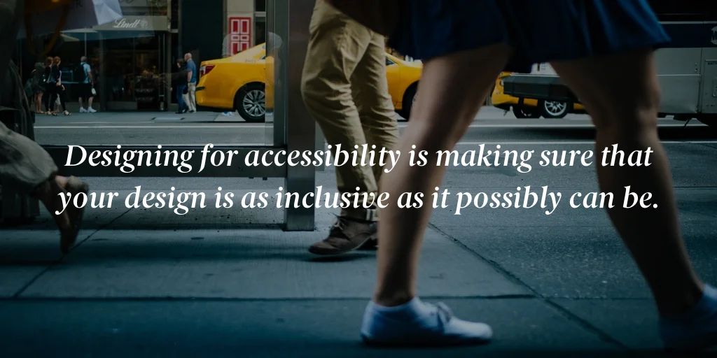 Designing for accessibility is making sure that your design is as inclusive as it possibly can be. So whether your user suffers from bad eye sight, color blindness, or they simply aren’t used to using computers/the internet, designing to be as inclusive as possible should be your goal. Rather than asking your designer friend sitting next to you if your design makes sense, how about asking the janitor, your mum, someone’s child AND your designer friend. Aim for a broad panel of people for feedback and your designs will be more accessible.